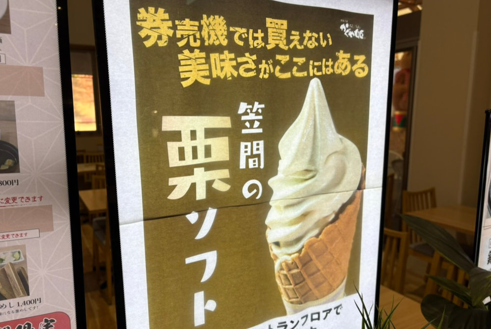 最後にご紹介するのは「和食レストラン 常陸乃國 かぐや姫」のメニュー、笠間の栗ソフト。レストランを利用すると食べられます。